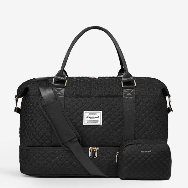 Дорожня сумка Lovevook Aril Travel Duffel Bag — стильний чорний компаньйон для коротких поїздок, спорту та будь-яких пригод. Виготовлена зі стійкого до бризок армованого поліестеру з бездоганною стьобаною текстурою, ця сумка поєднує елегантний вигляд із практичною функціональністю. Розміри основної сумки — 48 × 34,5 × 20 см, вага — лише 940 г. : ідеально для ручної поклажі. До комплекту входить косметичка розміром 7,87" × 6,5" вагою 95 г. у тому ж стьобаному дизайні з фурнітурою під золото.