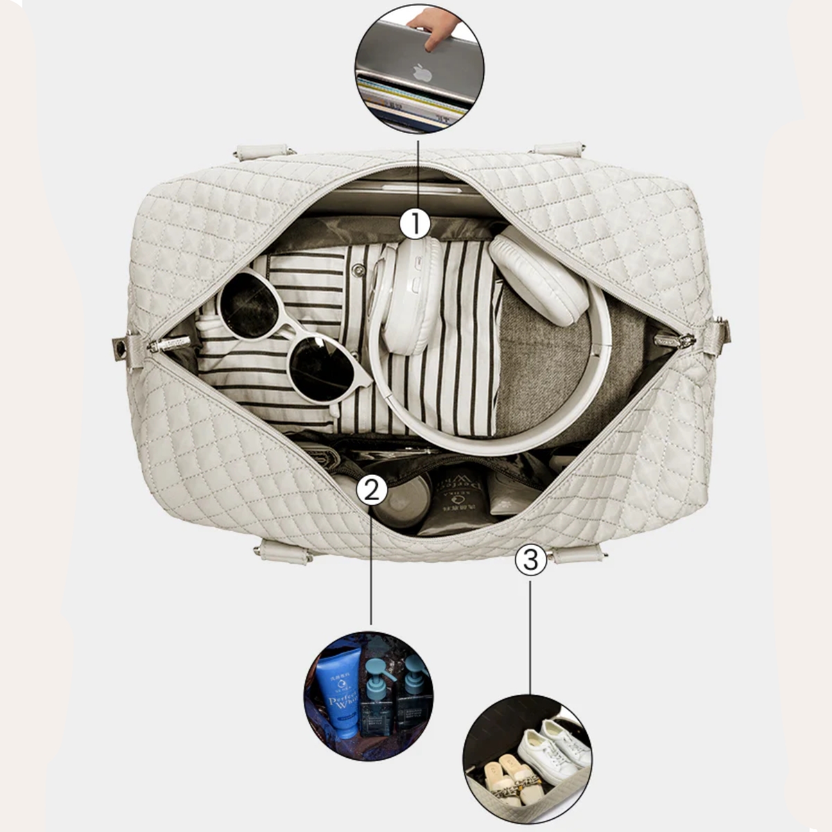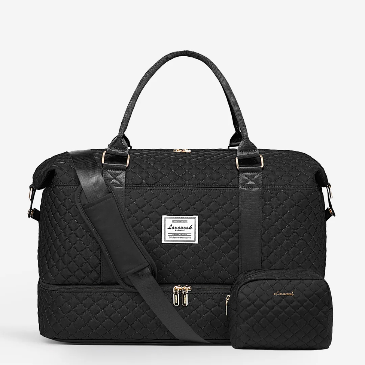 До комплекту входить основна дорожня сумка та невелика косметичка Lovevook у тому ж стьобаному дизайні з золотою фурнітурою.