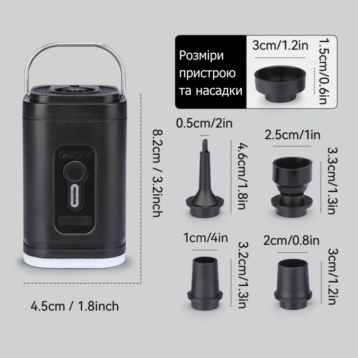 Mark Ryden MR-CQB поєднує в собі потужний насос і кемпінговий ліхтар в одному корпусі. До комплекту входять 5 насадок різних діаметрів, сумка для зберігання та зарядний кабель. Пристрій ефективно накачує і викачує повітря, що робить його універсальним помічником вдома і на природі. Керування відбувається за допомогою єдиної кнопки на корпусі, що дозволяє використовувати портативний насос однією рукою.