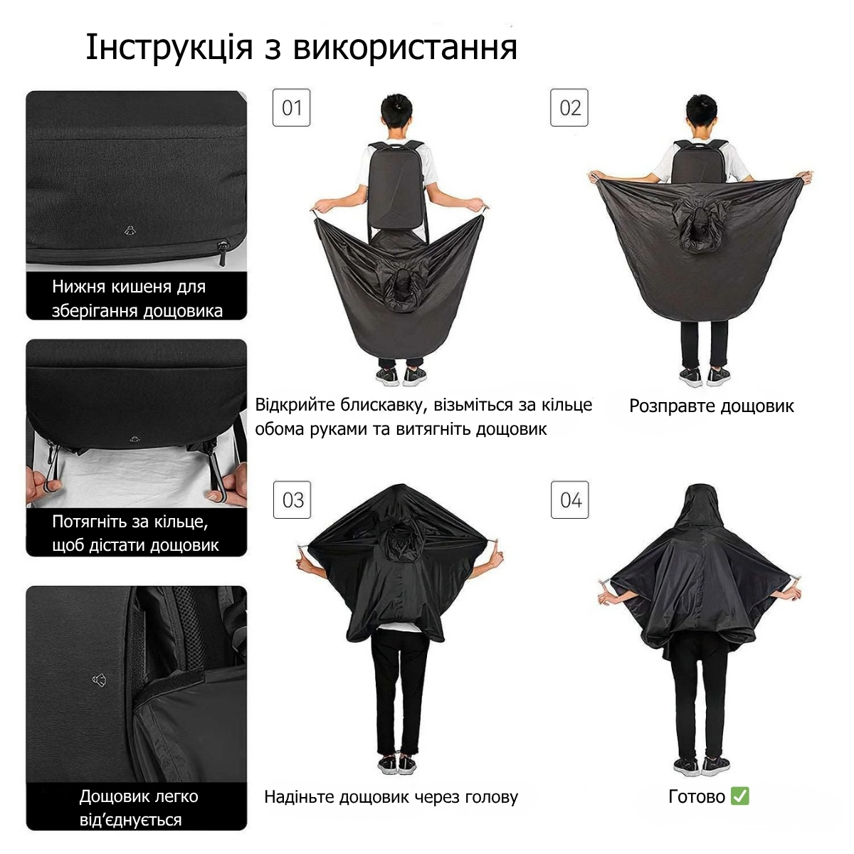 У нижній кишені рюкзака зберігається повноцінний дощовик-пончо, який легко дістати в кілька секунд: достатньо відкрити блискавку, взятися за кільце і витягнути плащ. Дощовик знімається для прання та повертається на місце після висихання. Така функція захищає і власника, і вміст рюкзака від раптового дощу без потреби шукати парасолю.