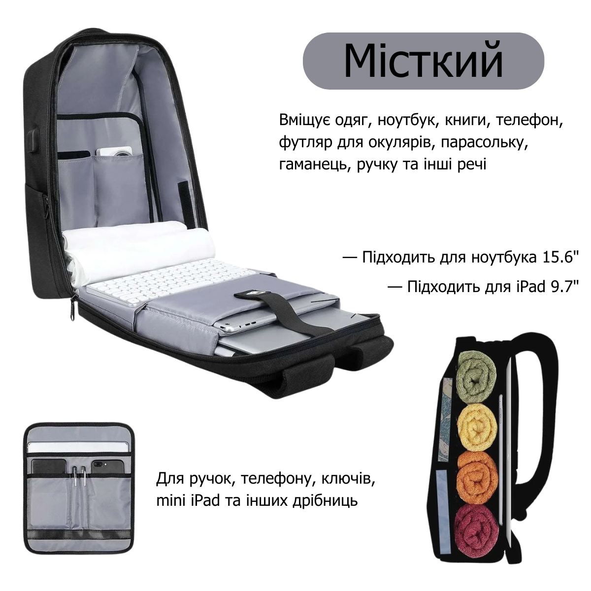 Так, відділення для ноутбука розраховане на пристрої з діагоналлю до 15,6 дюйма включно.