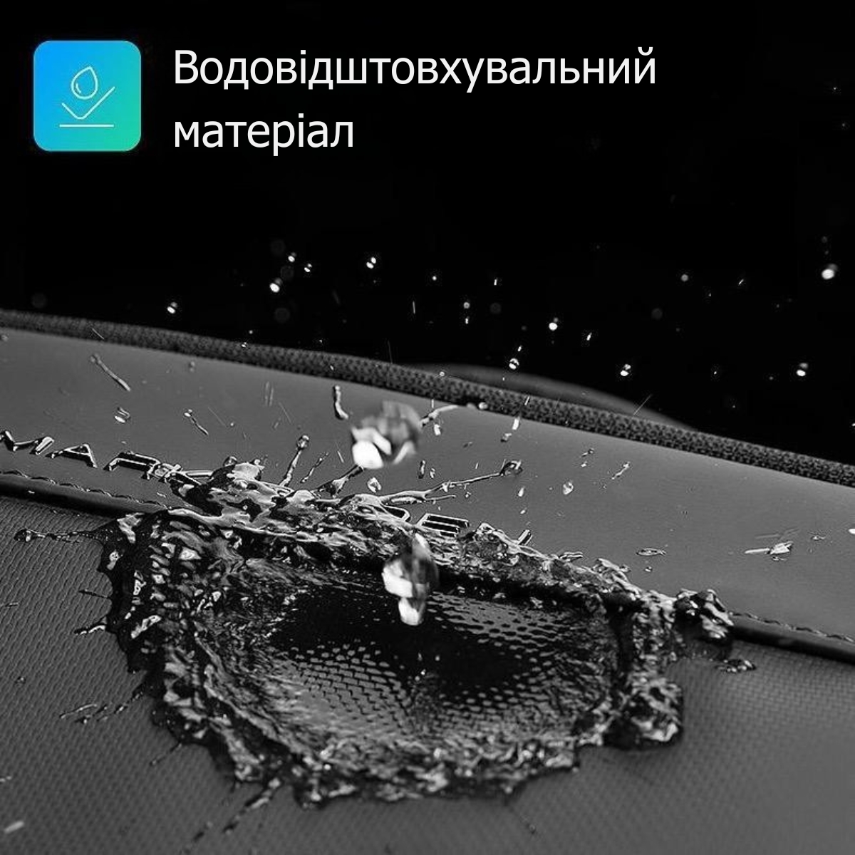 Рюкзак виготовлений із водовідштовхувальної тканини Oxford/PU, яка захищає вміст від бризок і легкого дощу, однак не призначена для повного занурення у воду.