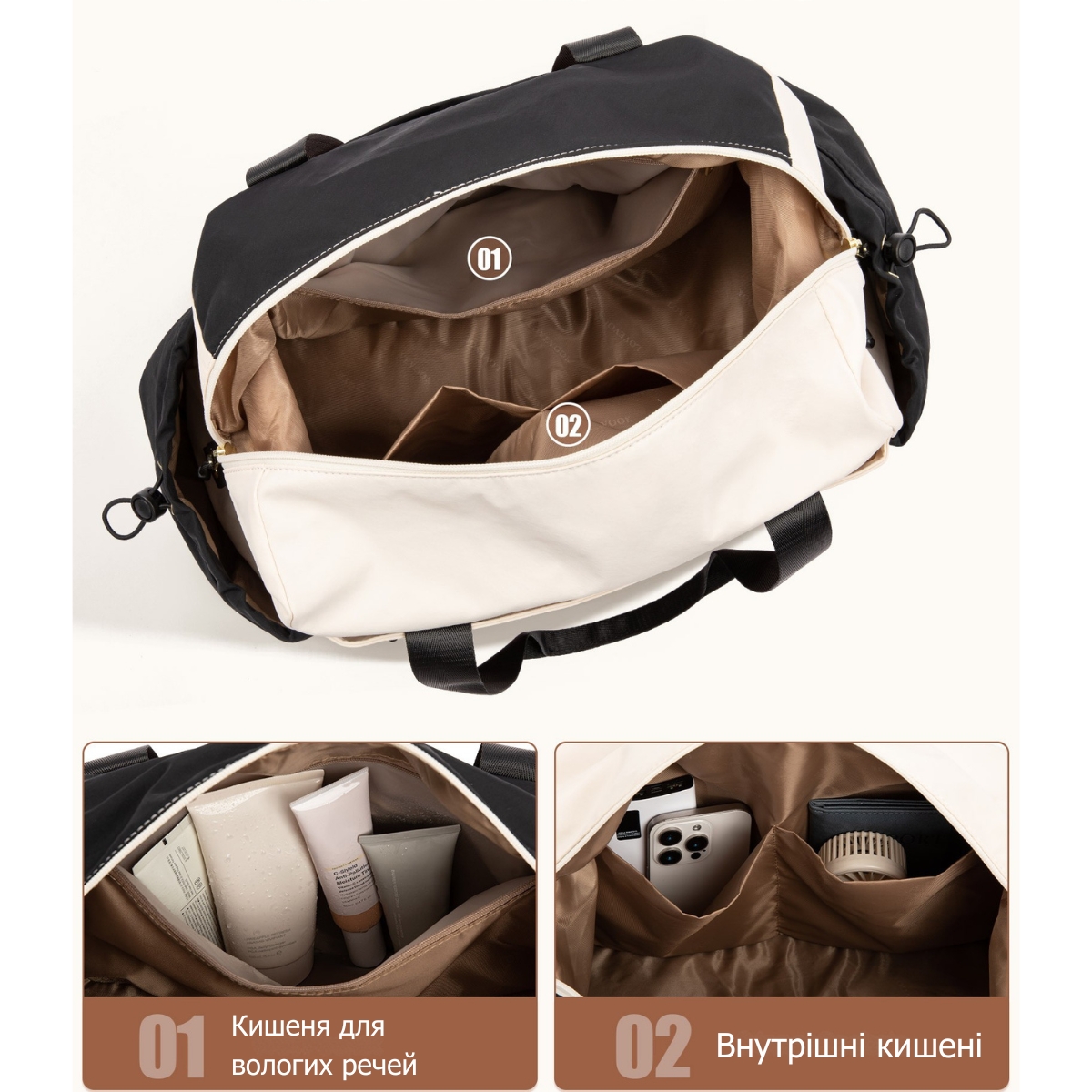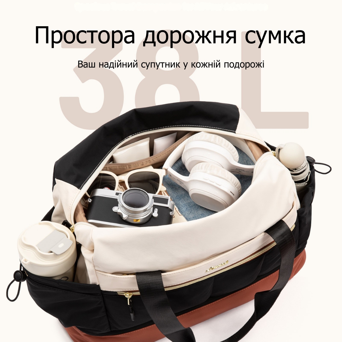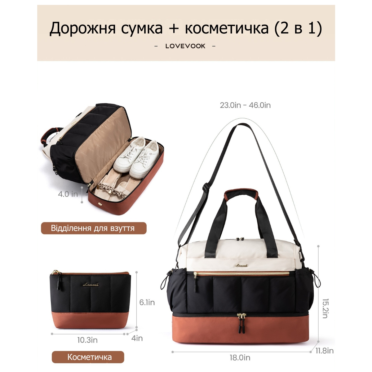 Дорожная сумка Lovevook — вместительный и стильный компаньон для путешествий, который сочетает изысканный дизайн с практичностью. Набор из двух предметов включает основную сумку и компактную косметичку — полноценное решение для поездок любой длительности. Контрастное сочетание кремового и терракотового цветов с золотистой фурнитурой придаёт модели выразительный и современный вид. Сумка разработана для тех, кто ценит порядок в дороге и не хочет жертвовать стилем ради функциональности.