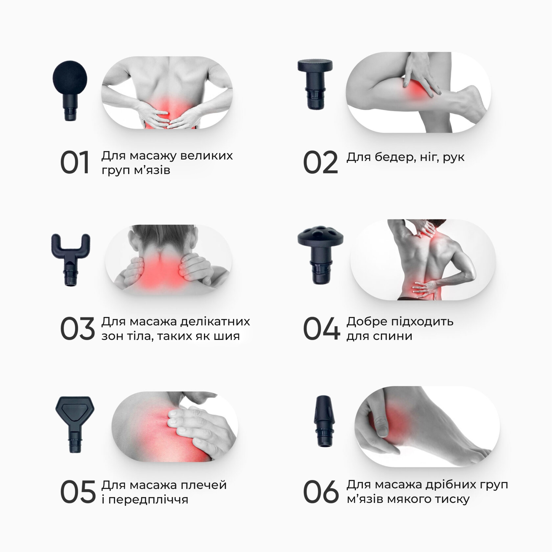 В комплекте предусмотрено 6 профессиональных насадок, которые позволяют адаптировать массаж под разные группы мышц и типы воздействия. Круглая насадка идеально подходит для крупных мышечных зон, плоская — для рук, ног и бёдер, U-образная — для шеи и деликатных участков, насадка-гриб отлично подходит для спины, лопаточная — для плеч и всего тела, а насадка-пуля обеспечивает точечную проработку триггерных зон. Такая универсальность делает этот перкуссионный массажер незаменимым инструментом для полноценного ухода за телом.