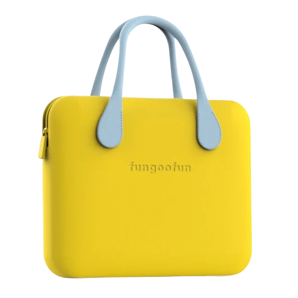 Яркий желтый цвет в сочетании с пастельно-голубыми ручками делает Fungoofun заметным и модным аксессуаром. Лаконичный силуэт и фирменное тиснение бренда придают изделию завершенный вид. Сумка одинаково хорошо смотрится в офисе, университете или на прогулке.