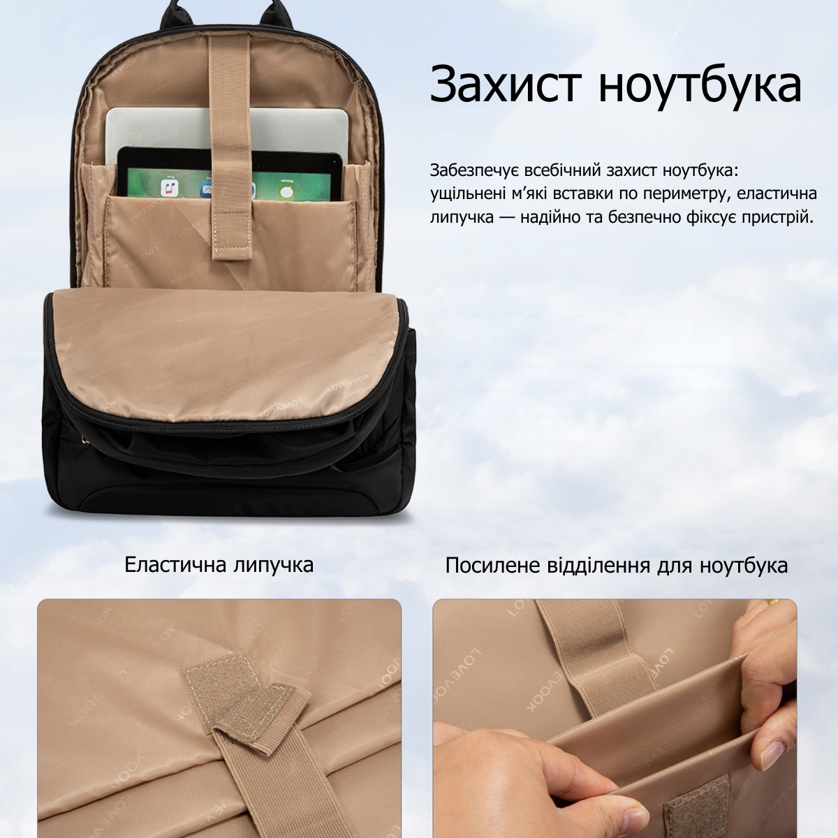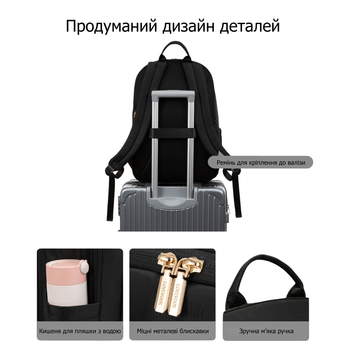 На задней панели расположен ремень для крепления на ручку чемодана, что упрощает перемещение в аэропортах и на вокзалах. Прочная текстильная ручка с увеличенной площадью опоры позволяет носить рюкзак в руке без дискомфорта. Плавная золотистая металлическая фурнитура Lovevook не только выглядит стильно, но и выдерживает интенсивное использование.