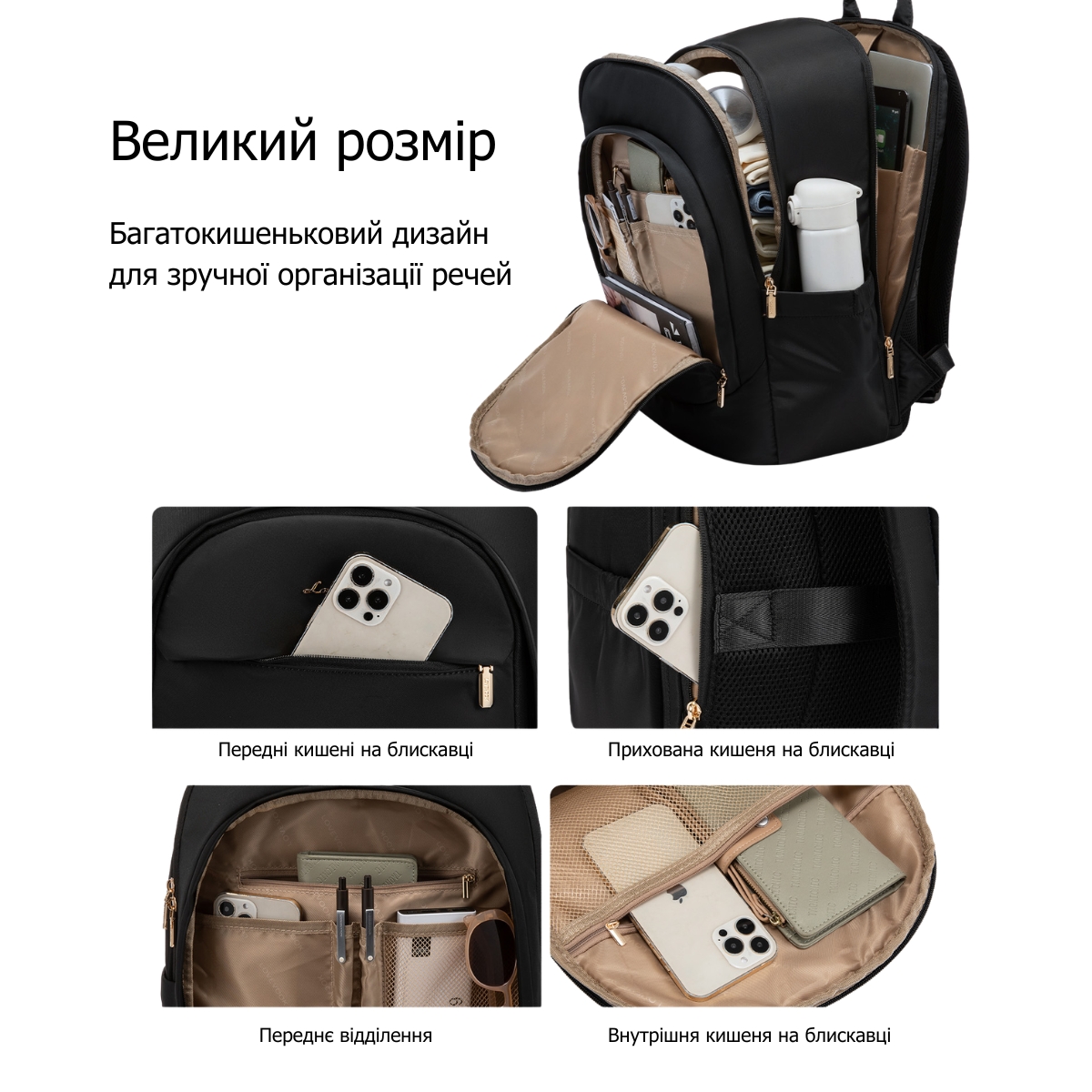 Модель имеет фронтальное отделение с органайзером, которое содержит отдельные карманы для ручек, сетчатый карман и отдельное место для телефона, большой центральный отсек с внутренним карманом и скрытый карман на спинке для ценных вещей. Отдельный боковой карман вмещает термос или бутылку любого размера. Такая организация пространства позволяет держать вещи в порядке и быстро находить нужное.
