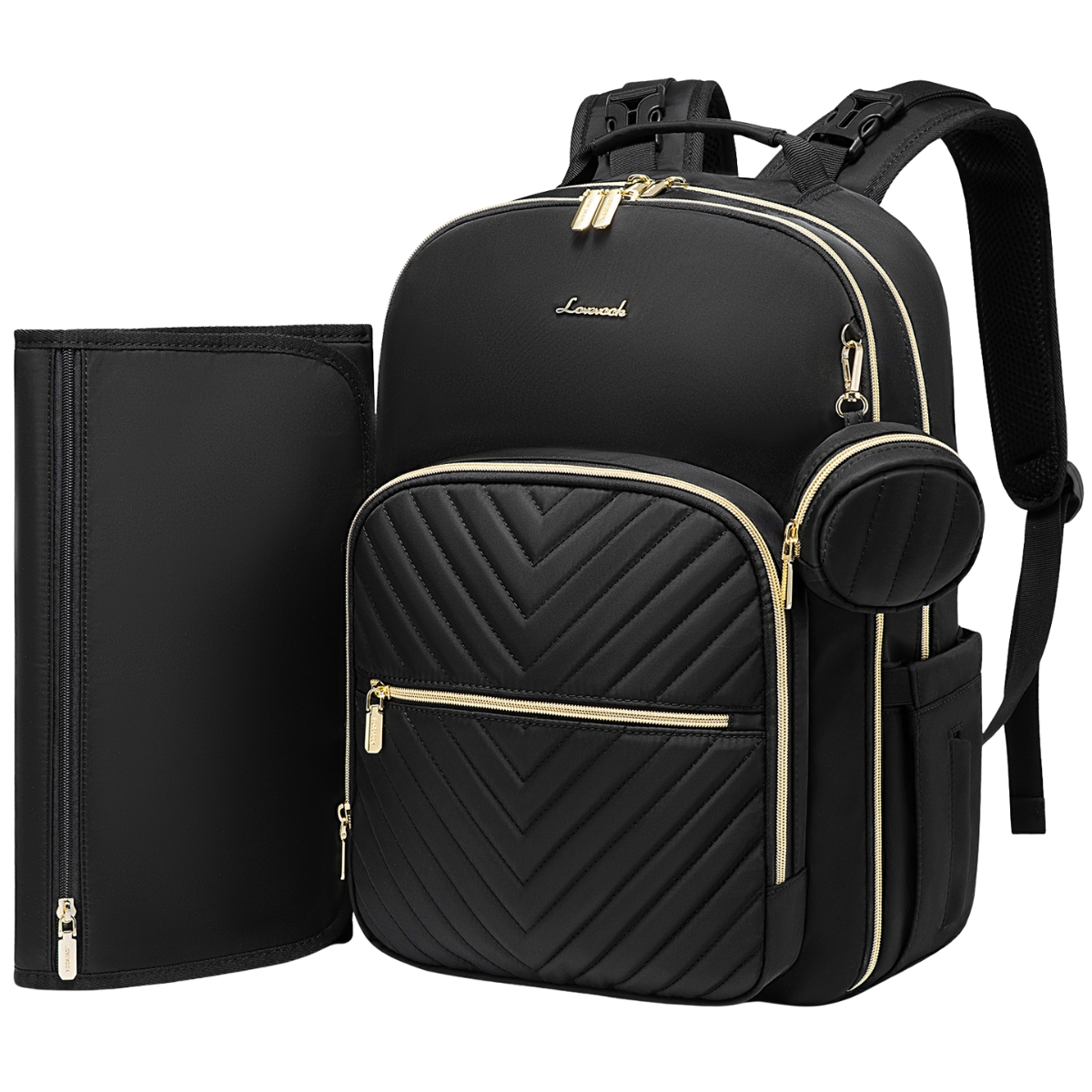 Жіночий рюкзак для ноутбука 15.6” Lovevook**— це багатофункціональний жіночий рюкзак, що поєднує простору організацію для дитячих речей із захистом і комфортом у дорозі.** Модель розроблена для молодих мам, які цінують порядок і стиль: чорний колір із золотистою фурнітурою виглядає доречно як на прогулянці, так і в місті. Просторий основний відділ вміщує підгузки, одяг, іграшки та аксесуари — усе, що потрібне для прогулянки з дитиною. Ергономічна спинка та регульовані лямки забезпечують рівномірне розподілення навантаження навіть при повному завантаженні.