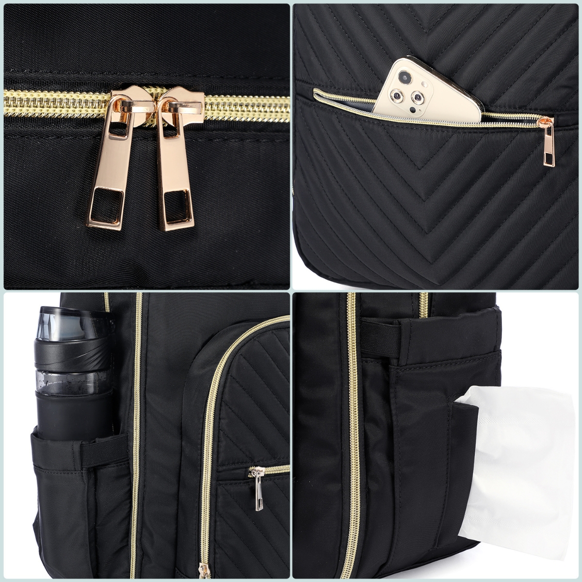 Жіночий рюкзак для ноутбука 15.6” Lovevook оснащений просторим основним відділом, що легко вміщує всі необхідні речі для малюка і мами під час тривалих прогулянок або поїздок. Конструкція передбачає окреме відділення для підгузків і вологих речей, бічну кишеню для пляшечок, захищену від крадіжок задню кишеню та відсік для ноутбука до 15,6". Модель виконана із міцного зносостійкого нейлону, а золотисті блискавки додають йому вишуканого вигляду. Знімний тримач для пустушки та бічна кишеня для серветок роблять використання ще більш зручним.