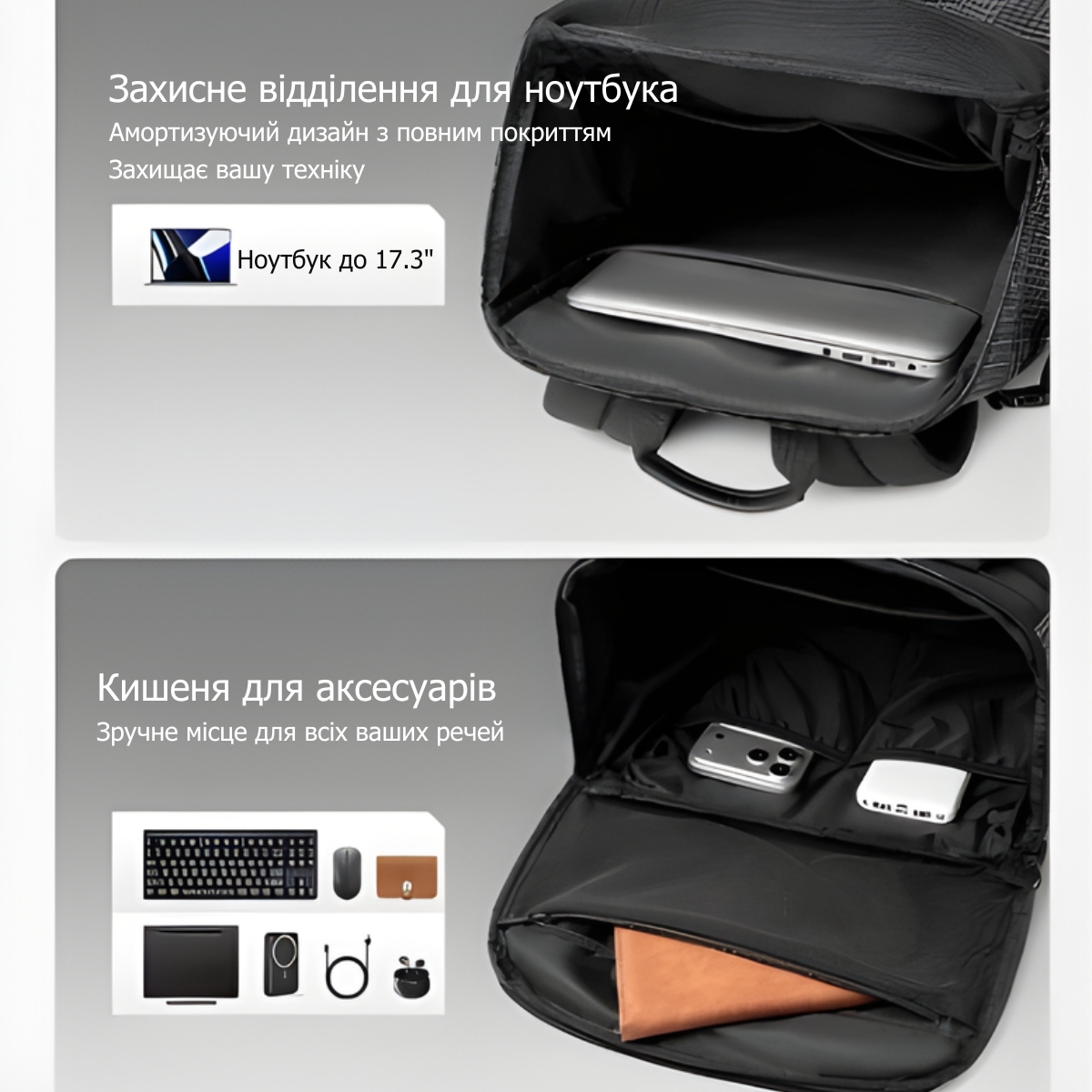 Основний відсік обладнано спеціальним чохлом із повним покриттям і амортизуючим ефектом — ноутбук до 17,3 дюйма надійно фіксується та не б'ється під час руху. Окрема кишеня для аксесуарів розрахована на мишу, портативну клавіатуру, графічний планшет, павербанк і навушники, тримаючи кожну річ на своєму місці. Це робить модель ідеальним вибором для фрілансерів, дизайнерів та інших спеціалістів.