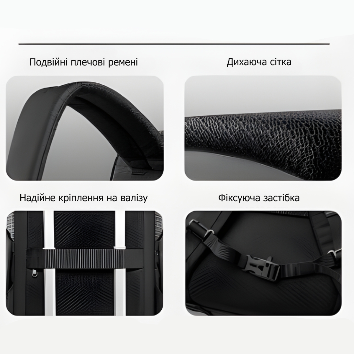 Так, рюкзак оснащено спеціальним кріпленням, яке надійно фіксує його на ручці валізи під час подорожей.