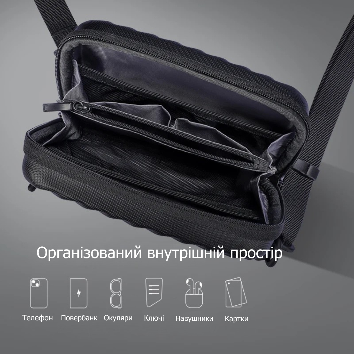 Двостороння блискавка відкриває доступ до добре організованого внутрішнього простору з кількох відділень. Головний відсік вміщує смартфон, павербанк, окуляри, автомобільні ключі, навушники та картки, а внутрішня кишеня на блискавці надійно фіксує дрібні речі. Такий розподіл дозволяє швидко знайти потрібне, не перебираючи все.